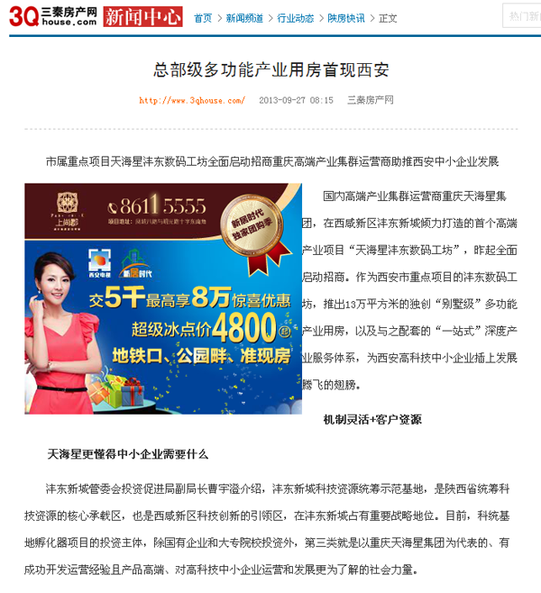 9月27日,西安主流媒体集中报道天海星沣东数码全面启动招商。当地媒体龙头——《华商报》以半版篇幅进行了重点报道,陕西日报、西安晚报、新浪网、大秦网、西部网、华商网、搜房网、三秦房产网及沣东新城政府刊物《沣东时迅》也在显著位置刊发项目进展及产业运营服务理念,在客户中引起了较大反响。